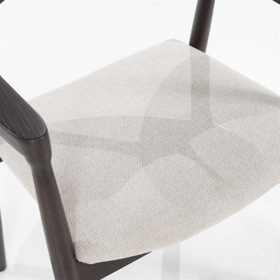 Deze prachtige houten eetkamerstoel heeft een slank ontwerp. Het frame is gemaakt van essenhout met daarop een gestoffeerde zitting. Dit is een prachtige combinatie en nodigt uit om lang te tafelen.